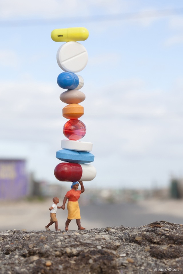 A tiny religious figure stands before a fallen Coca-Cola can adorned with a small cross, resembling a place of worship. This humorous piece plays with scale and symbolism, turning trash into something sacred.More cute art: 7 Tiny Street Dramas by Slinkachu