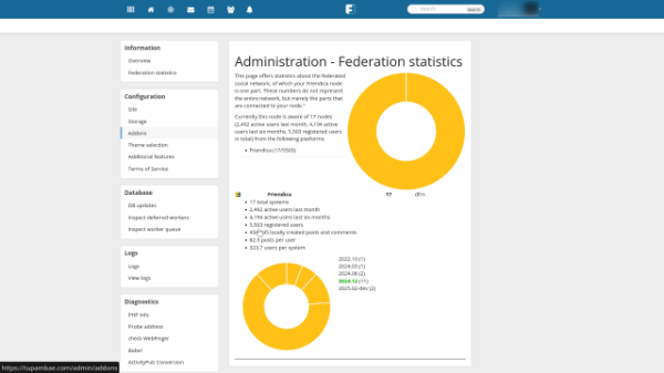 2025-03-01 Friendica 'Interrupted Fern' 2024.12 (¿?)- 1576PHP version 8.1.31 php.ini /**/8.1/fpm/php.iniupload_max_filesize 2Mpost_max_size 8Mmemory_limit 128MMySQL / MariaDBmax_allowed_packet 16777216