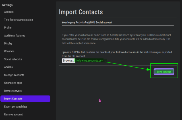 •I didn't make myself clear. If you enter your Mastodon handle in the βYour legacy ActivityPub/GNU Social accountβ field, your contacts will be imported directly from that account. This means you can skip the CSV import.