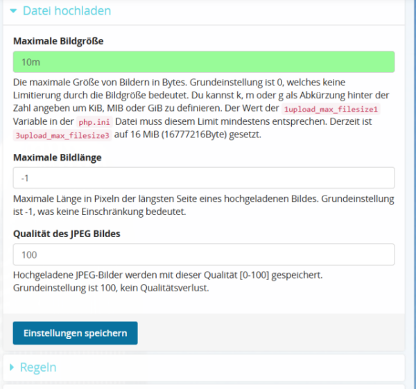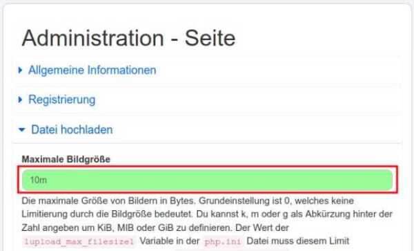 •Nachdem du die ini Datei nach oben gesetzt hast, solltest du schauen, was du im Admin-Bereich (/admin/site) hinterlegst hast. Das ist nach Bild- und Videodateien getrennt einstellbar.