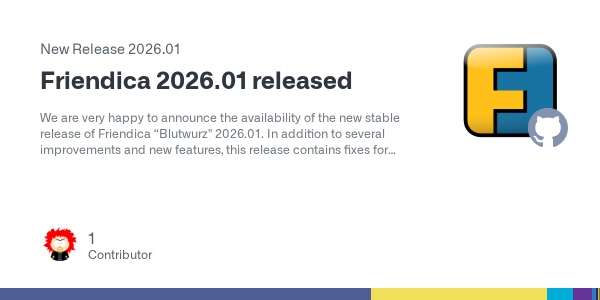 We are very happy to announce the availability of the new stable release of Friendica “Blutwurz" 2026.01. In addition to several improvements and new features, this release contains fixes for secur...GitHub