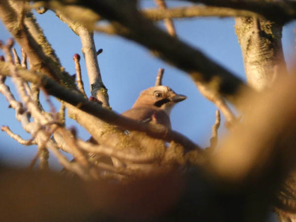 Na, bei dem Wetter musste ich doch auch mal raus und gucken, was die Natur so macht im Dorfe ... und der Eichelhäher ist schon ein verdammt unruhiger Bursche. Durch das Geäst konnte ich dann noch diesen kleinen Schnappschuss machen.