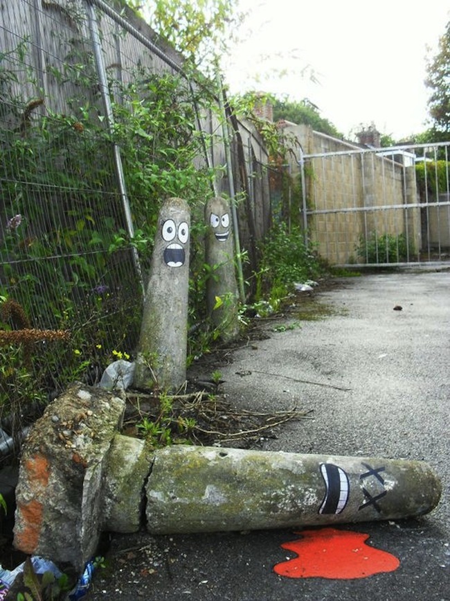Content warning: Street art from Limerick, Valdivia, Iran, Ôlas, Taiwan, and more! Expect a bollard turned octopus, a smiling brick tower, yarn-bombed stairs, a whole façade painted as miniature houses, and quick jokes on city walls. More: Made You Smile (11 Photos) 1. St