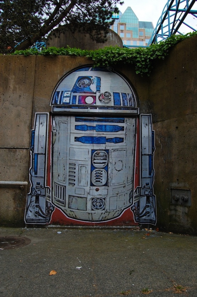 A painted R2-D2 holding flowers with a heart bubble, leaning toward a trash bin in a playful urban romance scene. More!: EFIX’s Clever Art (9 Photos)🔗 Follow EFIX on Instagram