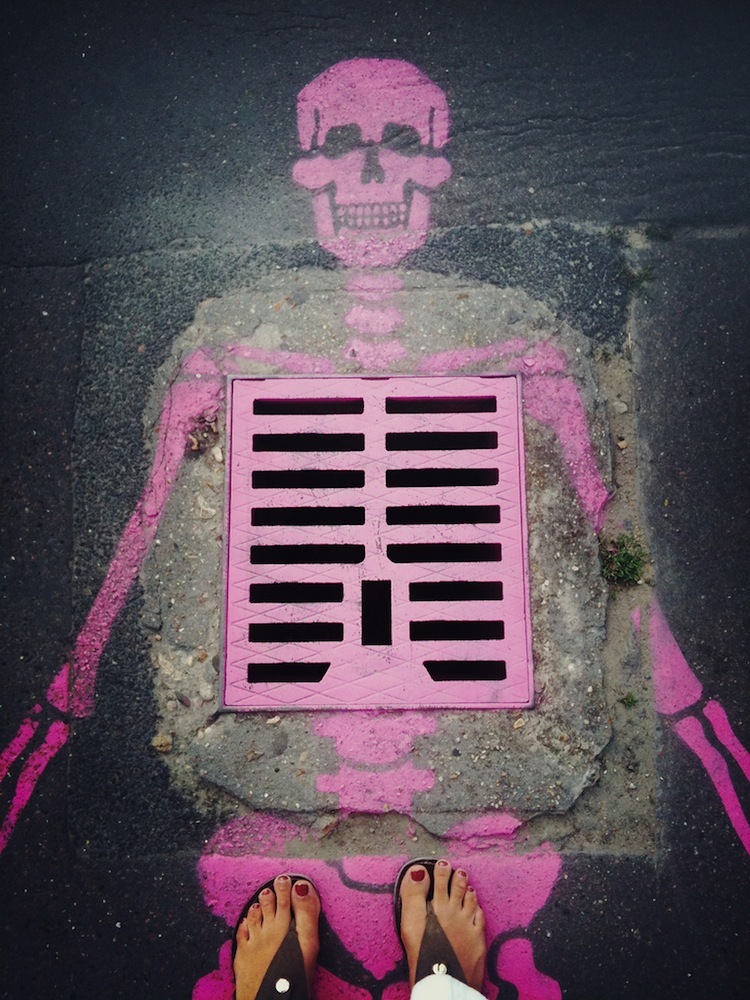 Two wall pipes painted with chalk shoes, turning ordinary infrastructure into the legs of a playful character.