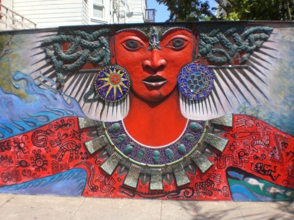 This colorful portrait honors Petra Galeana, a beloved cook. Surrounded by beans, lilies, and a glowing horizon, she’s painted with a glowing, almost divine expression.