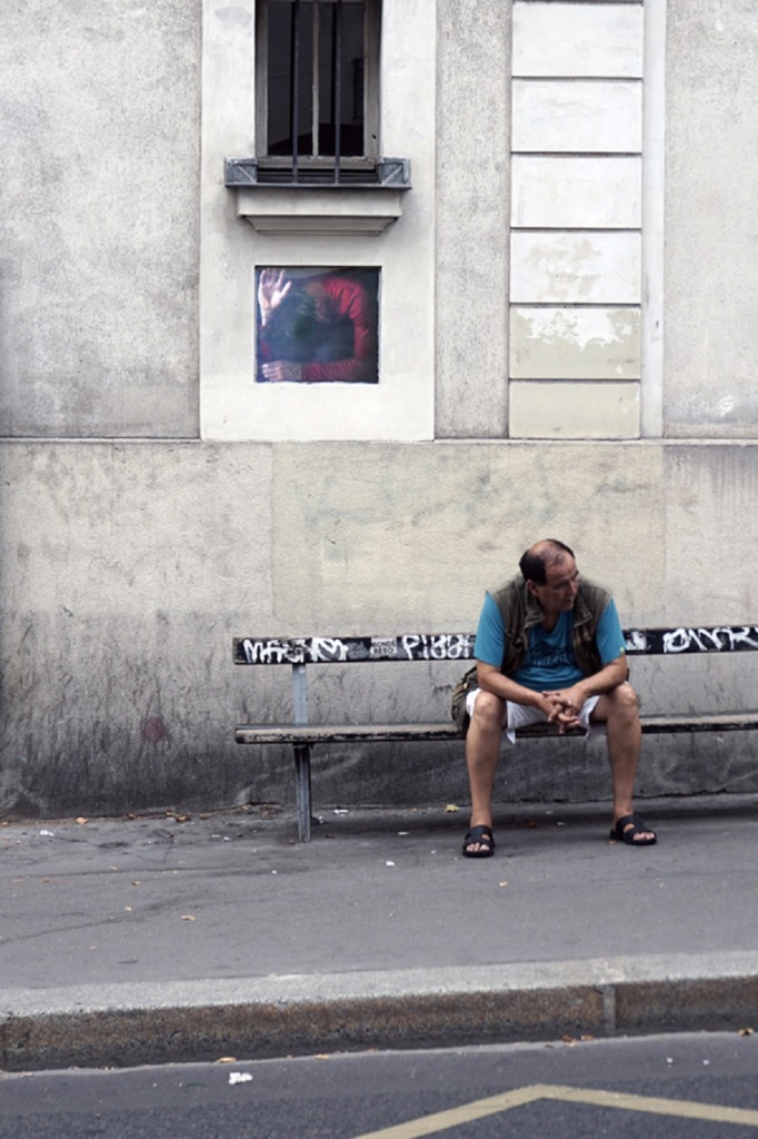 A character is found tightly packed in small boxes provided by the urban landscape.