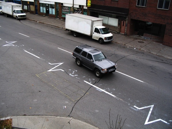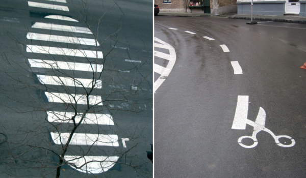 Initially motivated by his desire to see more bike paths in his hometown, his creations evolved from simple stencils to elaborate, imaginative designs that creatively use road markings and urban surfaces.