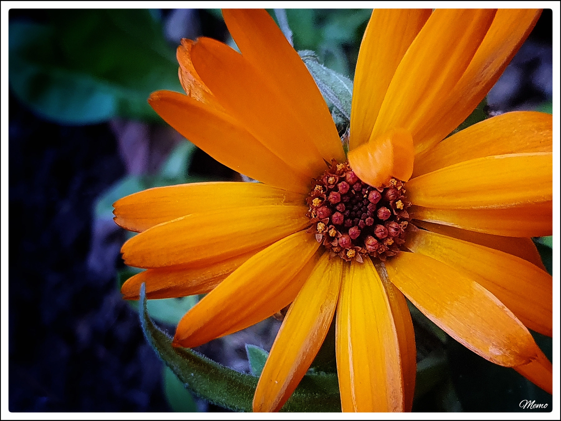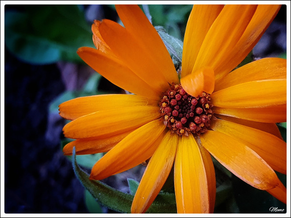 _(Bildbeschreibung: Nahaufnahme der orangefarbenen Blüte einer an einer geschützten Stelle wachsenden Ringelblume.)_