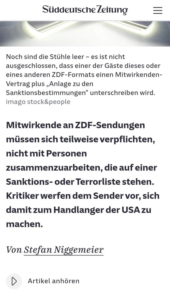 Das #ZDF übernimmt #Trump s #Sanktionslisten und verbietet die Zusammenarbeit mit Menschen, die darauf zu finden sind. Ich fasse die Geschwindigkeit nicht mehr, indem das ganze System in Deutschland nach amerikanischen Modell kippt.