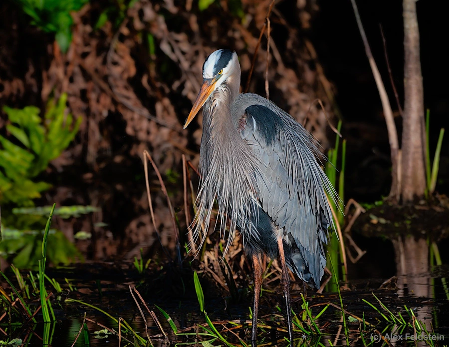 Painting of a portrait of a great blue heron in soft, warm light on a dark background. The neck is twisted into a loose figure eight with the bird looking towards the viewer.