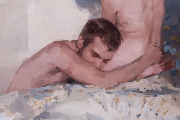 Male fragility, vulnerability, and sensitivity contrast with the strength and wholeness of the female figure, while their bodies merge to form a delicate, powerful image under a quick, precise brushstroke.