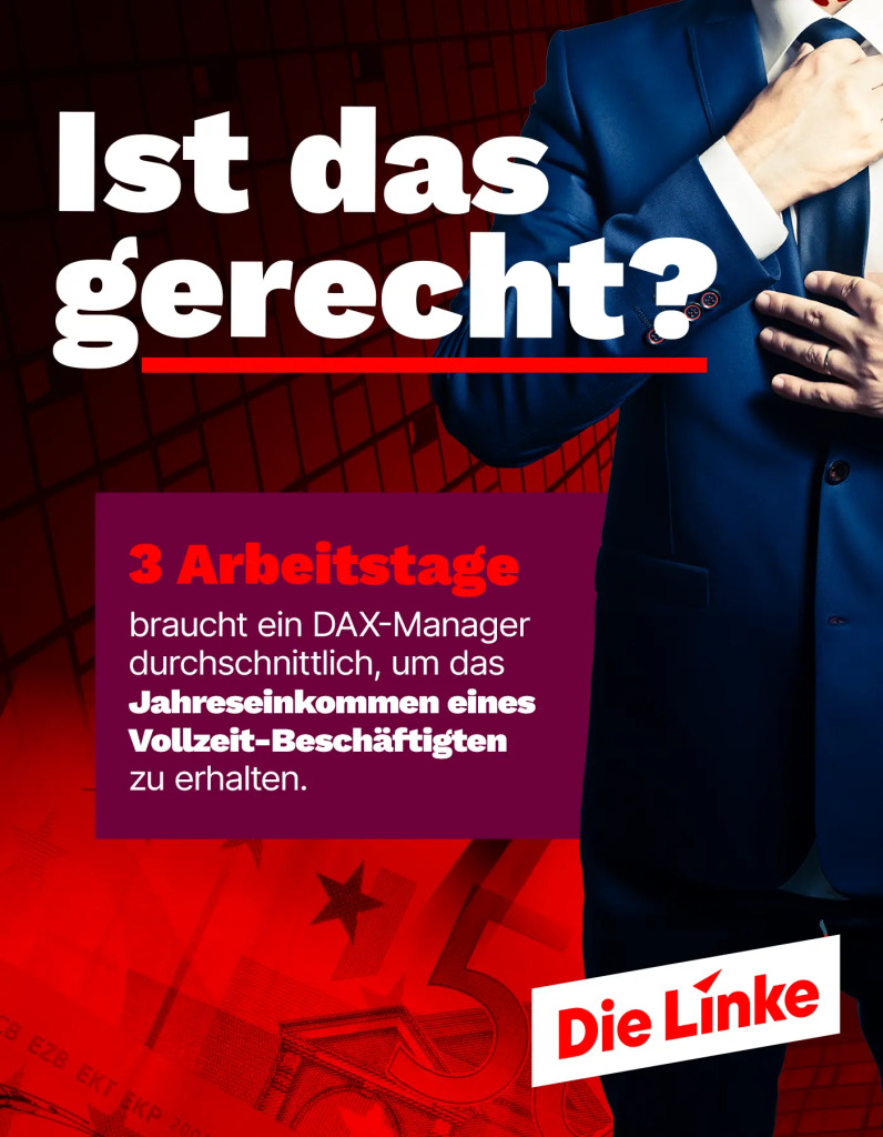 Millionen rackern sich täglich ab & kommen kaum über die Runden. #DAX #Manager dagegen haben nach nur 3 Arbeitstagen schon das Jahreseinkommen eines Vollzeit-Beschäftigten auf dem Konto. Verdient ist das nicht, denn der Reichtum wird auf dem Rücken der Beschäftigten erarbeitet!