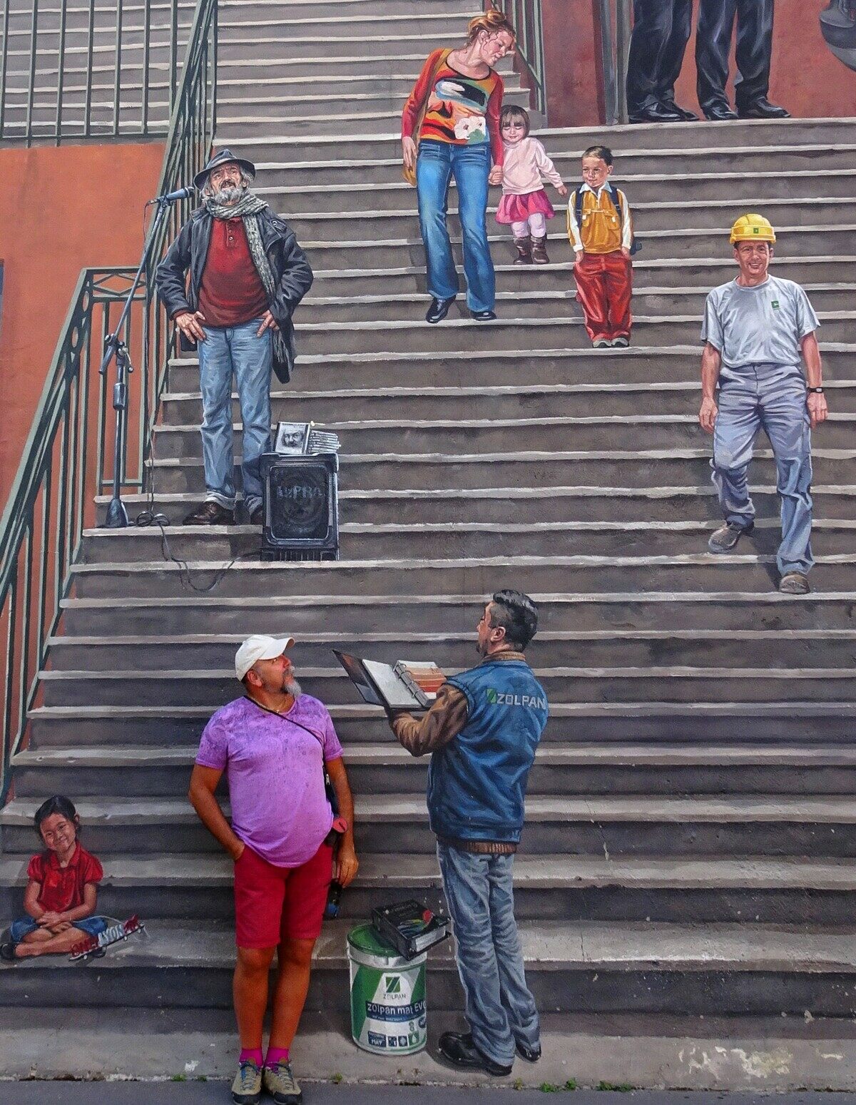 This small but powerful mural shows a man sipping coffee from a window, so lifelike that a passerby holds up his own cup in greeting. With painterly texture and perspective, the piece bridges reality and illusion in an intimate alley setting.