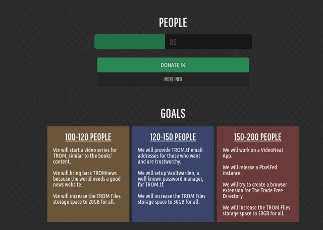 Soon we will add goals to the donation page, and if we reach those we can release some new stuff and/or increase the storage for TROM Files for everyone and so forth.