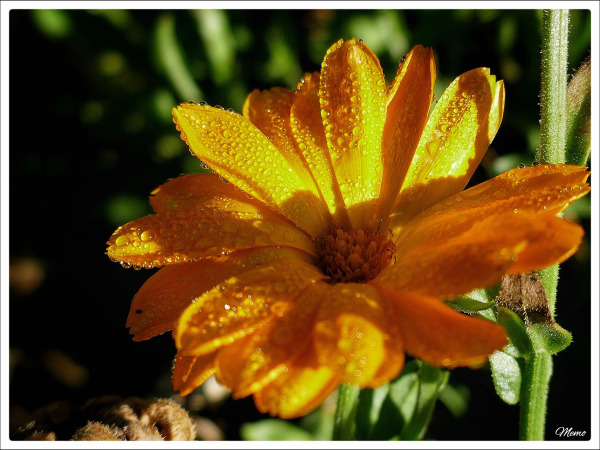 _(Bildbeschreibung: Eine orangefarbene Blüte der Ringelblume am frühen Morgen mit Wassertröpfchen auf den Blütenblättern.)_