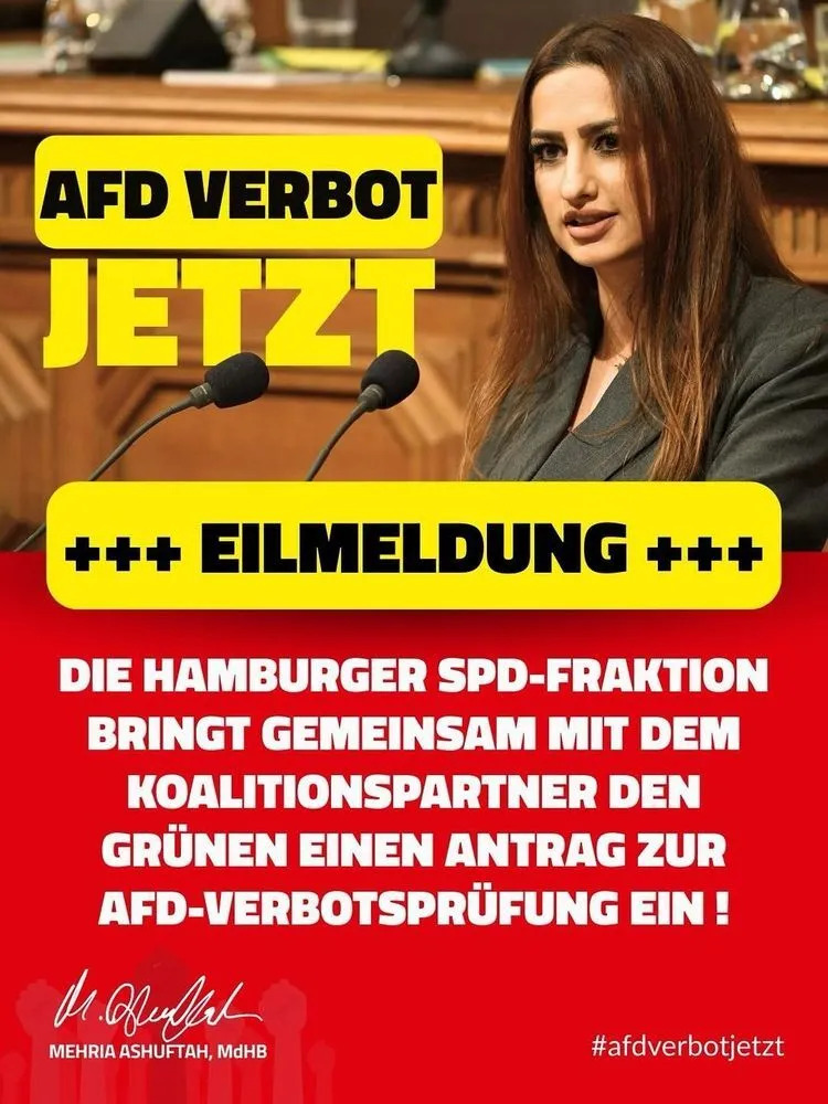 "Wir bringen als SPD-Fraktion gemeinsam mit unserem Koalitionspartner, den Grünen, in der Hamburgischen Bürgerschaft im kommenden Plenum am Mittwoch, den 14.1., einen Antrag zur Prüfung eines AfD-Verbots ein.