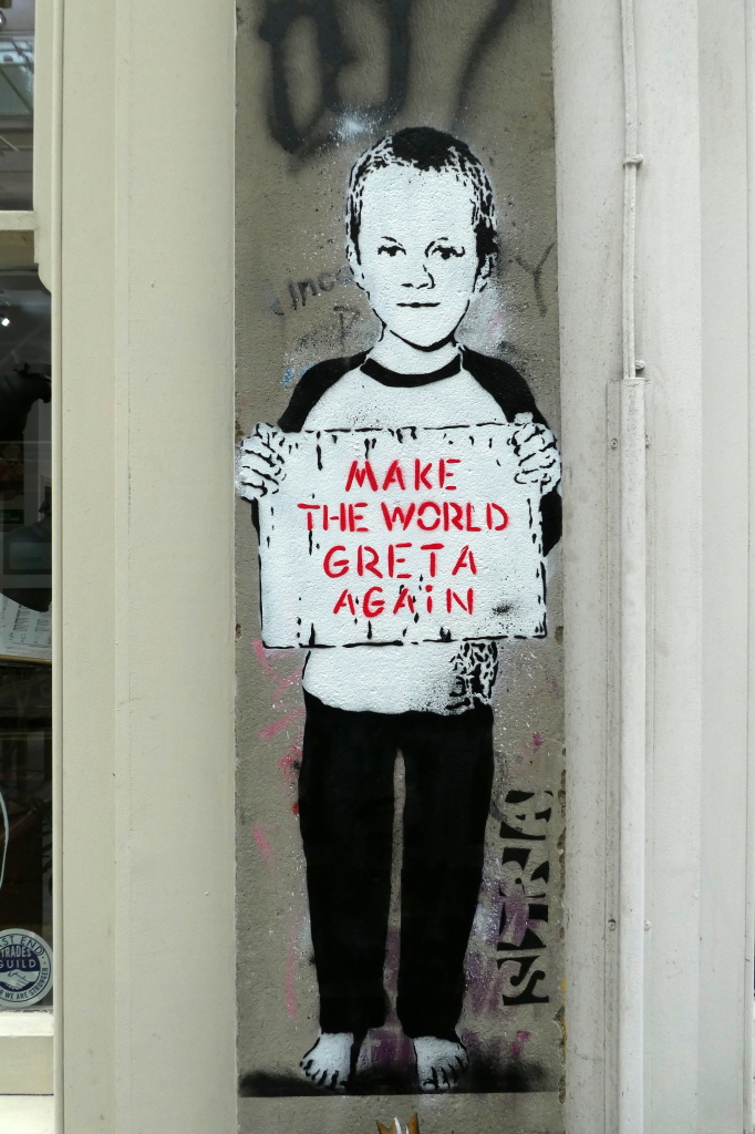 Content warning: Mural no Climate Change of Greta Thunberg by Jody Thomas. Photo by Andrew Gustar. In Bristol, Great Britain. By STRA. Photo by Duncan. In Shoreditch , London, Great Britain.