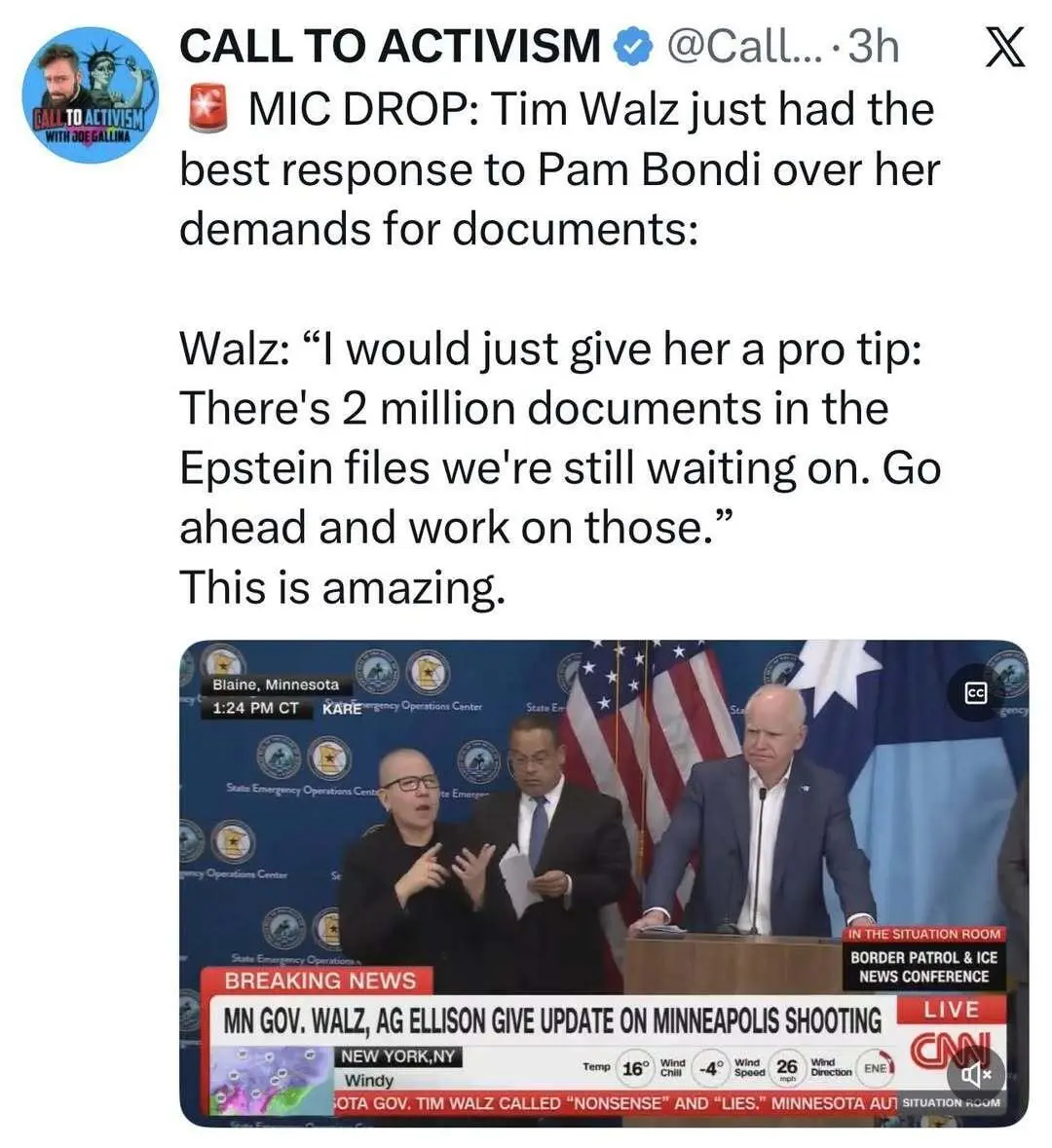 A "Minnesota mic drop", Colbert (?) called it, as Walz asked why they don't use staff time to get the #Epstein files out.