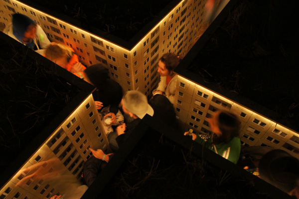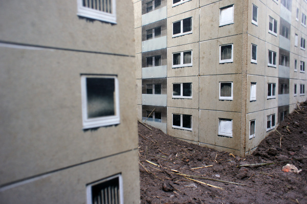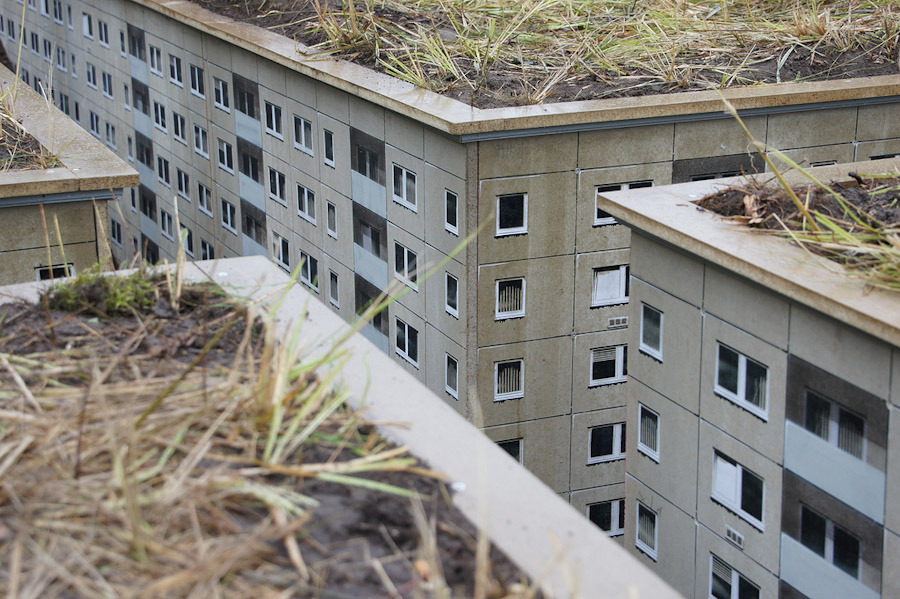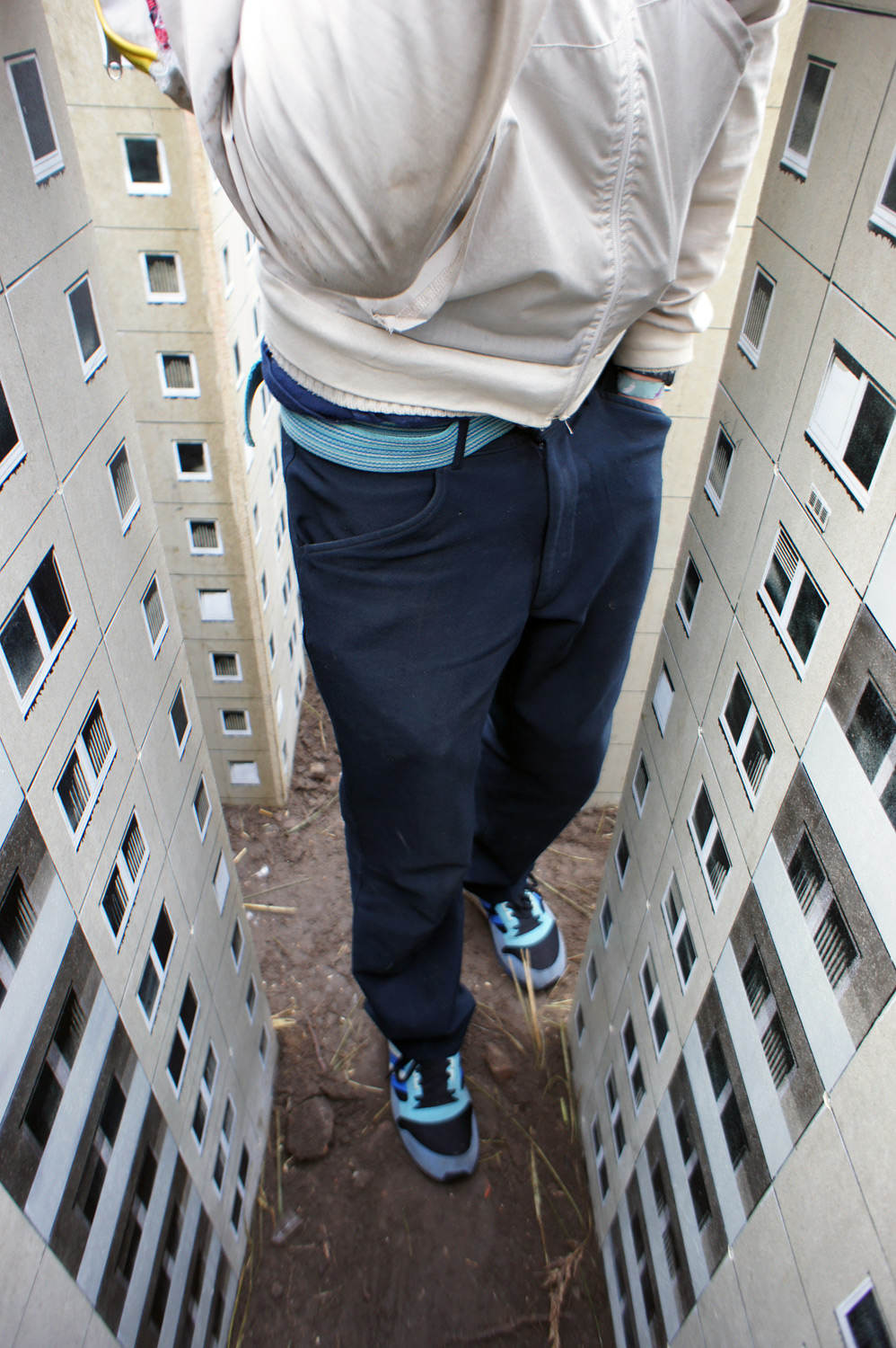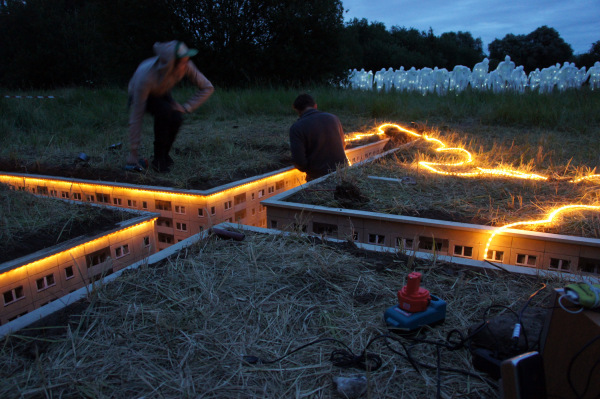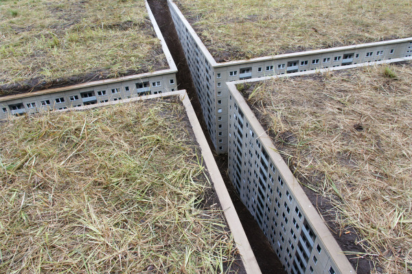 Usually I prefer to work on site by interfering with already existing structures. As I came there first, that’s what I found: endless meadow, trees and blue sky. Not exactly what I play with usually. So I decided to cut open the idyll, and pretend there is no endless meadow, but only rooftop-gardens of the disgust underneath …