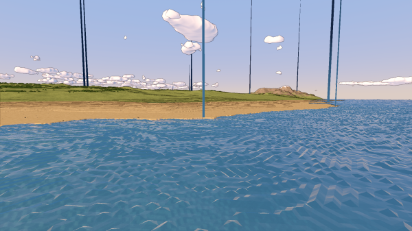 First tests with large-scale water (just rendering, no simulation ofc). Pretty much everything's terrible, a lot of work ahead 😅
