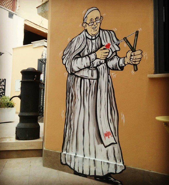 In this playful and romantic intervention, Oakoak transforms two red fire hydrant pipes into a pair of lovebirds gazing at each other. With painted eyes, arms, and floating hearts above them, the pipes appear to embrace, turning an ordinary urban feature into a charming street scene.More by Oakoak: From Homer Simpson to Obelix: Oakoak’s Genius Street Art (10 Photos)