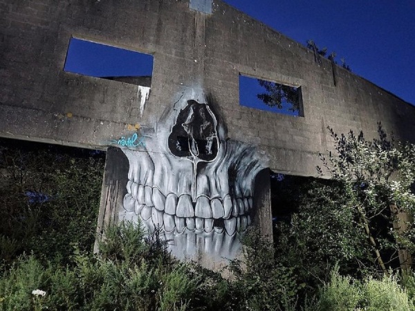 This crosswalk becomes a quirky playground in Oakoak’s hands, featuring cartoon faces and a 3D ghost.